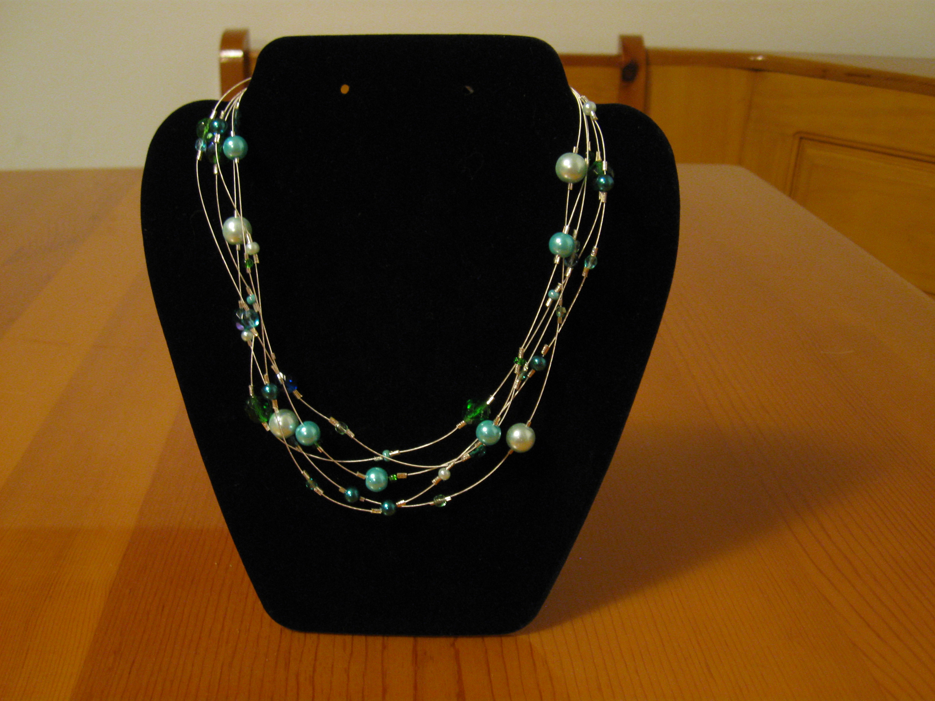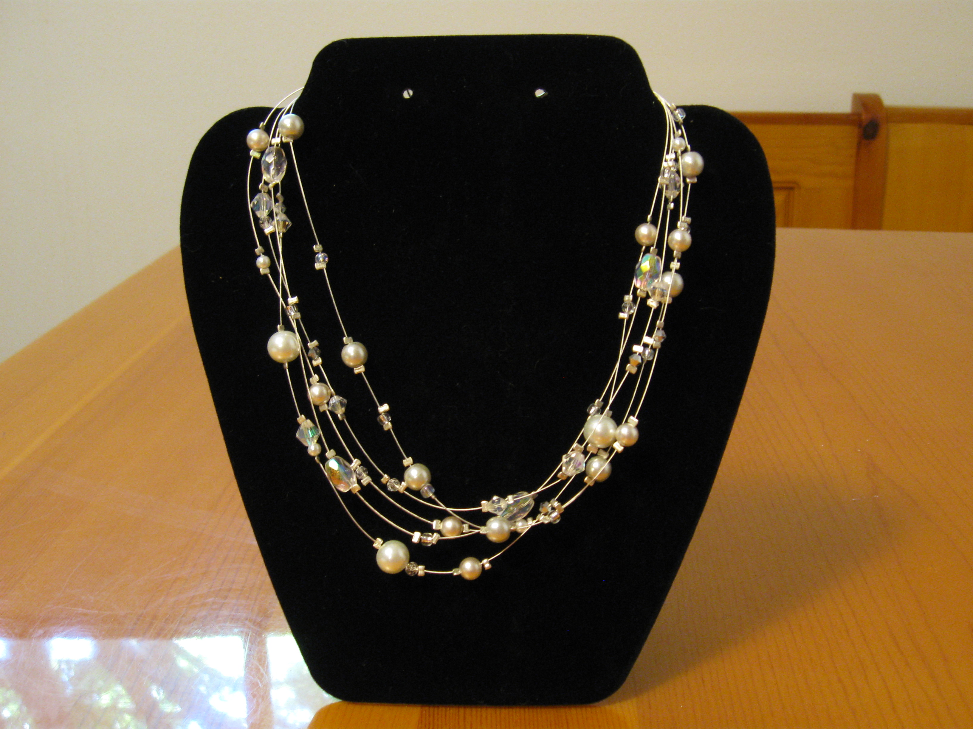 This handmade necklace has five different strands with liberally-spaced crystal and glass beads. The tiered strands drape across the neck, mixing the various shapes and colors of the beads to create a look that's unique and unforgettable. All metal used in my products are low- or no nickel, so they're safe for any skin type!